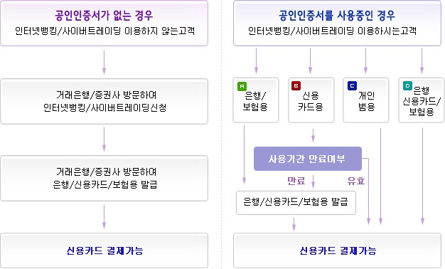 공인인증서를 갖고 계신 분은 신용카드용 공인인증서의 추가 발급없이 바로 신용카드 결제가 가능합니다. 공인인증서가 없으실경우, 각 은행의 홈페이지를 방문하여 인터넷뱅킹 서비스를 가입 후, 발급 받을 수 있습니다.